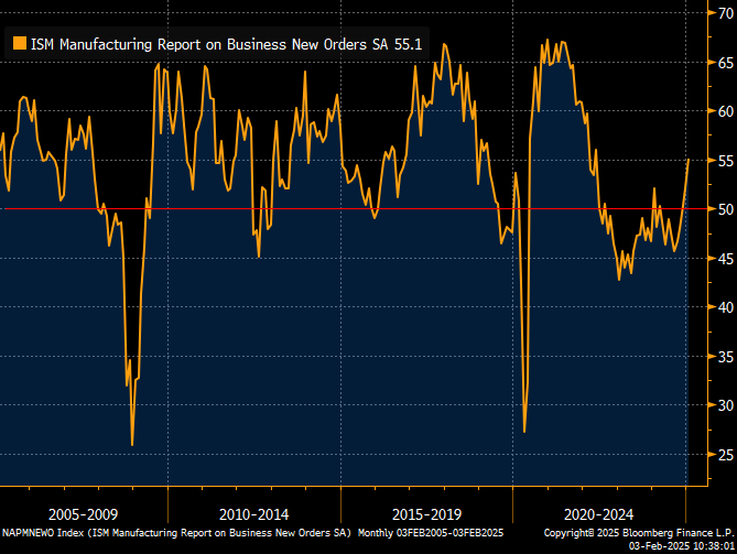 El segundo elemento, es que el sector industrial de la economía ha salido de su particular recesión y por fin da señales de vida. A principios de este mes, se dio a conocer el índice de nuevos pedidos en el sector industrial en EE.UU., según la encuesta de situación del instituto ISM, mostrando por fin una buena lectura tras 3 años de una situación bastante deprimida a causa de los elevados tipos de interés reinantes entre 2022 y 2024.
