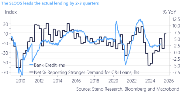Y en ese mismo sentido, los bancos estadounidenses están informando de que esperan una mayor demanda de crédito al consumo en los siguientes meses, algo que históricamente ha correlacionado con que el crédito al consumo, efectivamente, repunte, algo propio de los ciclos expansivos de la economía.