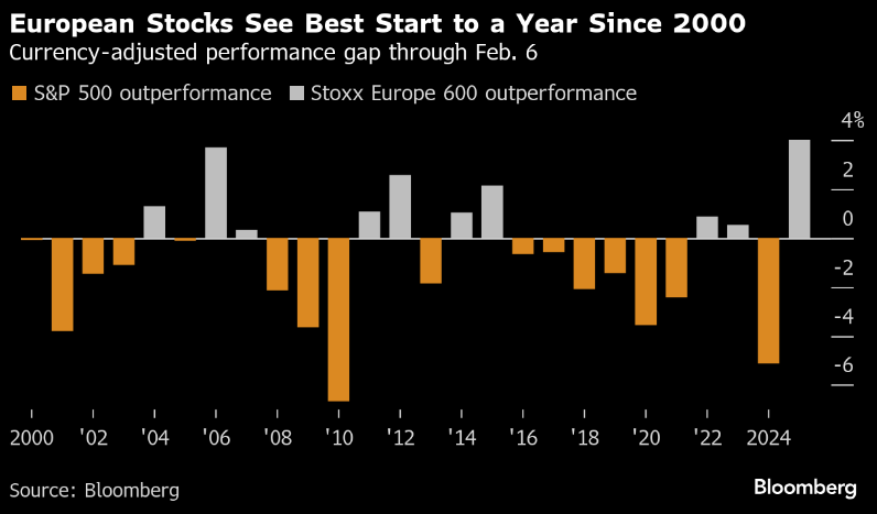 Si el año pasado la bolsa de Estados Unidos mostró un gran resultado, este año ha comenzado muy fuerte para la bolsa europea, tras haber roto ésta un lateral de 9 meses de duración. De hecho, es el mejor avance de comienzos de año de la bolsa europea con respecto a la estadounidense en décadas.