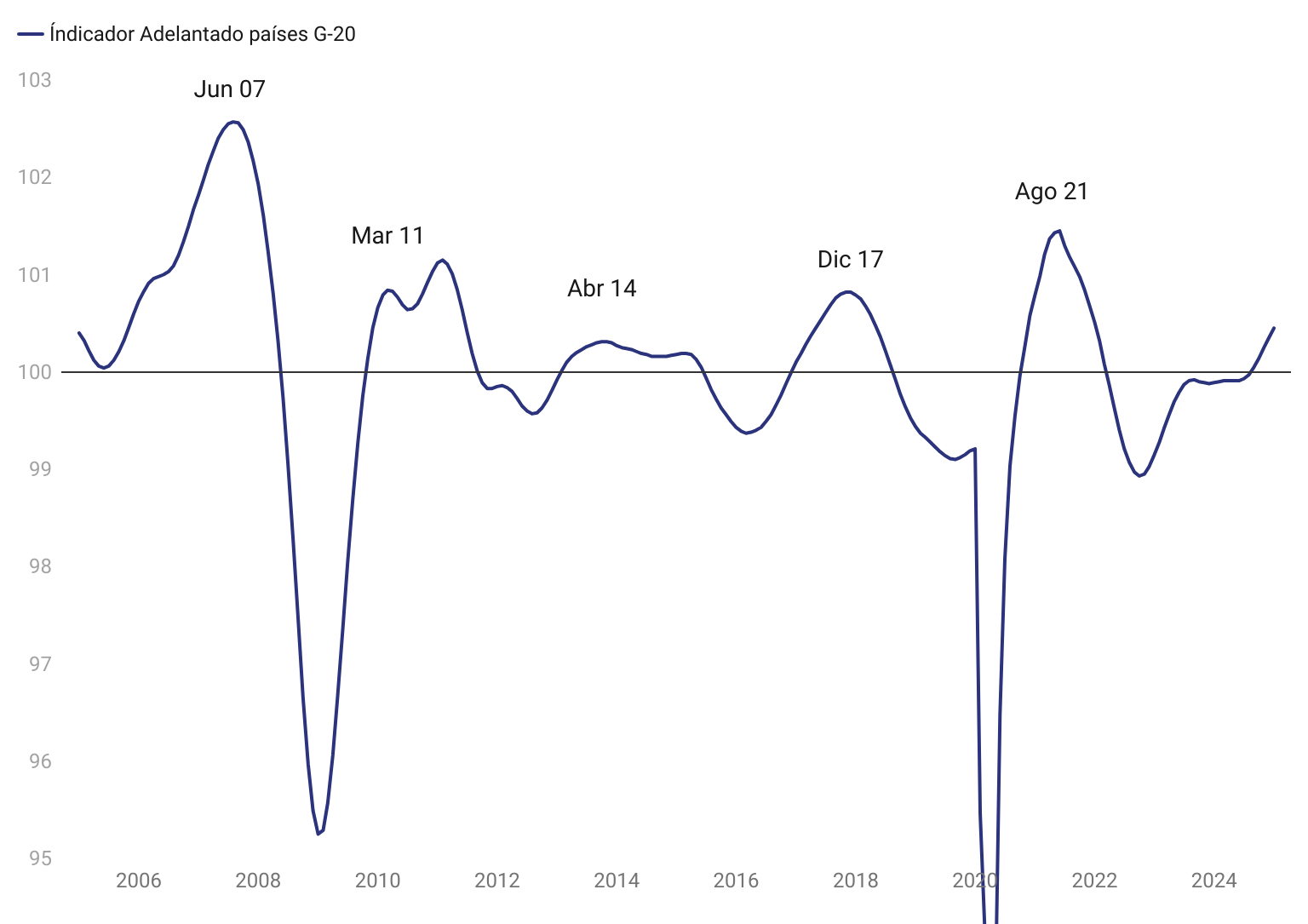 Por ello insisto continuamente en las bondades de observar el indicador adelantado del G20 (ciclo global) elaborado por la OECD, porque ayuda en gran medida a evitar sesgos. La última actualización se ha hecho el pasado 6 de febrero, referida al mes de enero de 2025 y mostrando que la economía global no solo sigue creciendo, sino que además lo hace de forma acelerada. Históricamente cuando este indicador adelantado asciende, ha correlacionado excepcionalmente bien con ascensos en los activos de riesgo como son las acciones.