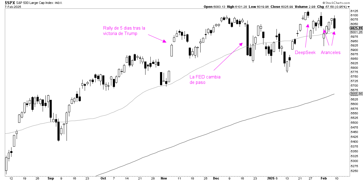 Luego, el 27 de enero y como decíamos anteriormente, el mercado se volvió a asustar a causa del algoritmo de inteligencia artificial chino, llamado DeepSeek. Y, durante las dos siguientes semanas, Trump ha asustado al mundo con las amenazas de aranceles a sus socios comerciales, cercanos y lejanos, miedos que luego se han evaporado en buena medida por el aplazamiento de dichos aranceles y la disposición de las partes para ponerse a negociar.