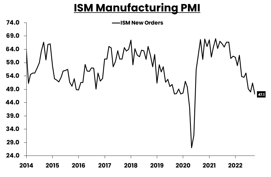 El dato de nuevos pedidos (gráfico anterior) que es el elemento más adelantado de la encuesta de situación que se hacen a las empresas industriales estadounidenses, declinó 4,2 puntos con respecto al mes anterior hasta registrar una lectura de 47,1 puntos al cierre de septiembre, la más débil del actual ciclo y claramente por debajo de la barrera de 50, lo cual señala que la economía estaría en recesión según este indicador.