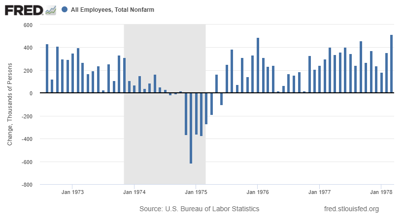 Al fin y al cabo eso es exactamente lo que ocurrió en la recesión de 1973-75. El clímax de la misma y del mercado bajista de la bolsa, se alcanzó cuando los datos de empleo estuvieron en su peor momento (siguiente gráfico).