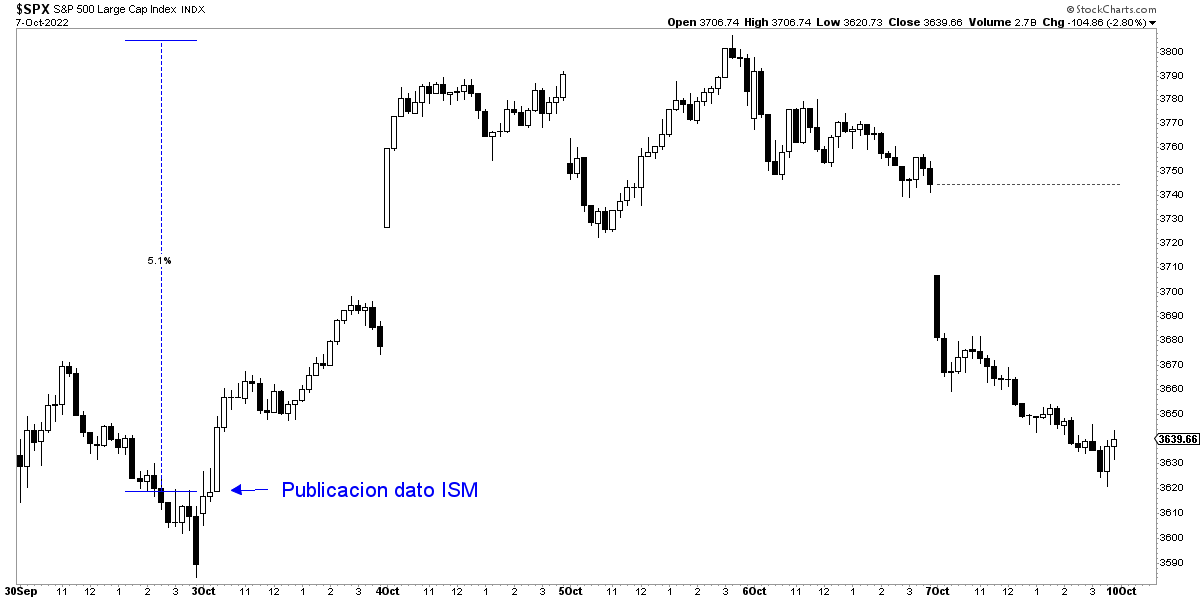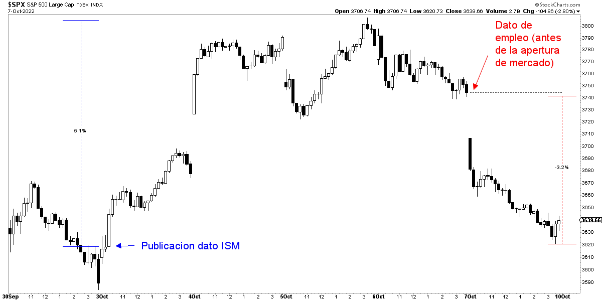 Durante los días 3, 4 y 5 de octubre el S&P 500 repuntó hasta un +5,20% y el día 6 fue un día de transición, volátil pero lateral. Finalmente el viernes 7 de octubre se publicó el dato oficial de creación de empleo en Estados Unidos, un dato macro que típicamente es el más importante del mes (y el que más volatilidad genera), pero que en el actual contexto inflacionario es es el segundo más importante tras el dato de inflación.