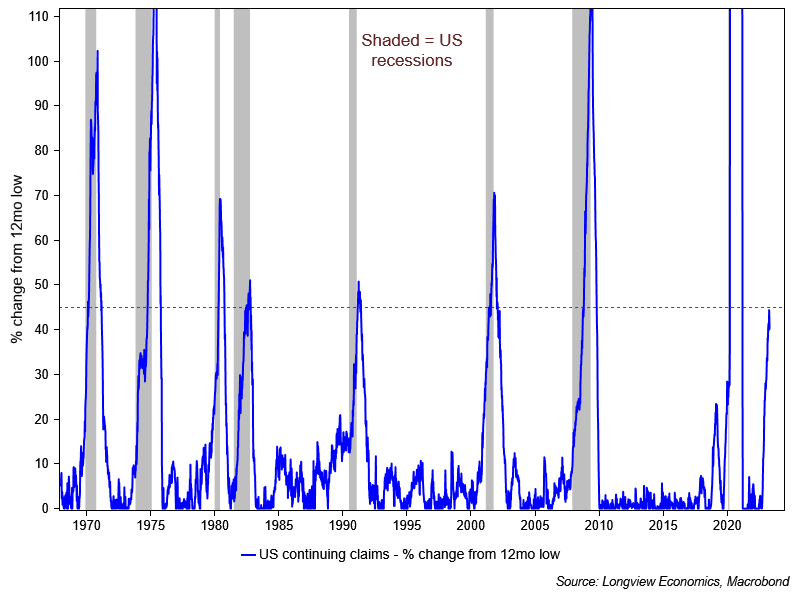 Como última pista por hoy, también vemos que las solicitudes continuas de paro están en niveles que también son propias de momentos de entrada en recesión.