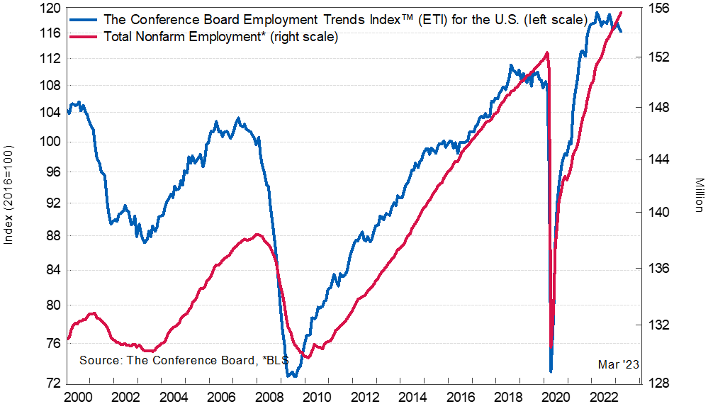 Por ejemplo, el indicador adelantado del empleo, el Employment Trend Index que calcula The Conference Board, volvió a descender en marzo hasta los los 116,24 puntos.