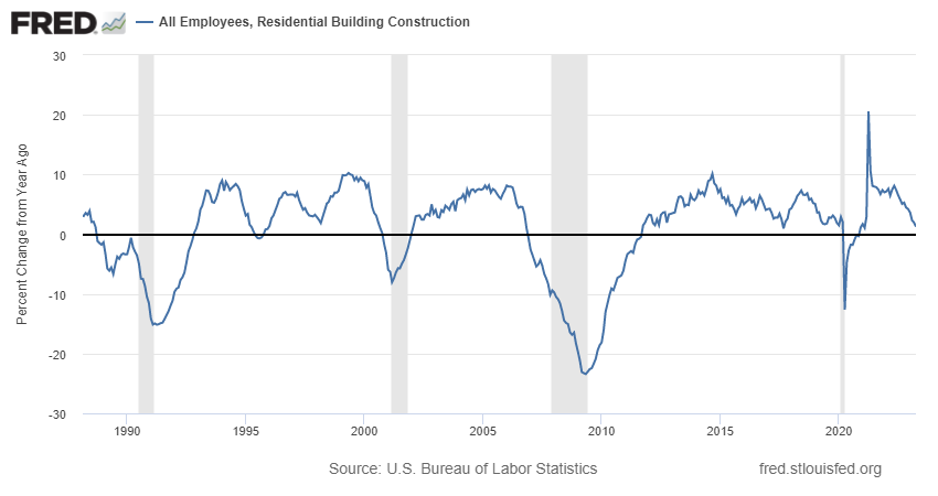 Si observamos el empleo en el sector de la construcción residencial, un dato interesante porque en muchos sentidos el ciclo inmobiliario es el propio ciclo económico, vemos que se está enfriando pero que aún no está en plena contracción, como ocurre antes de toda recesión. Le falta un poco más para "estar ahí".