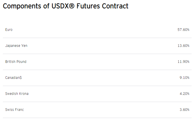 El US Dollar Index es un índice que calcula la evolución del dólar estadounidense con respecto a una cesta de monedas extranjeras, en concreto contra el euro, el yen, la libra, el dólar canadiense, la corona sueca y el franco suizo, con las ponderaciones que se muestran en la siguiente tabla.