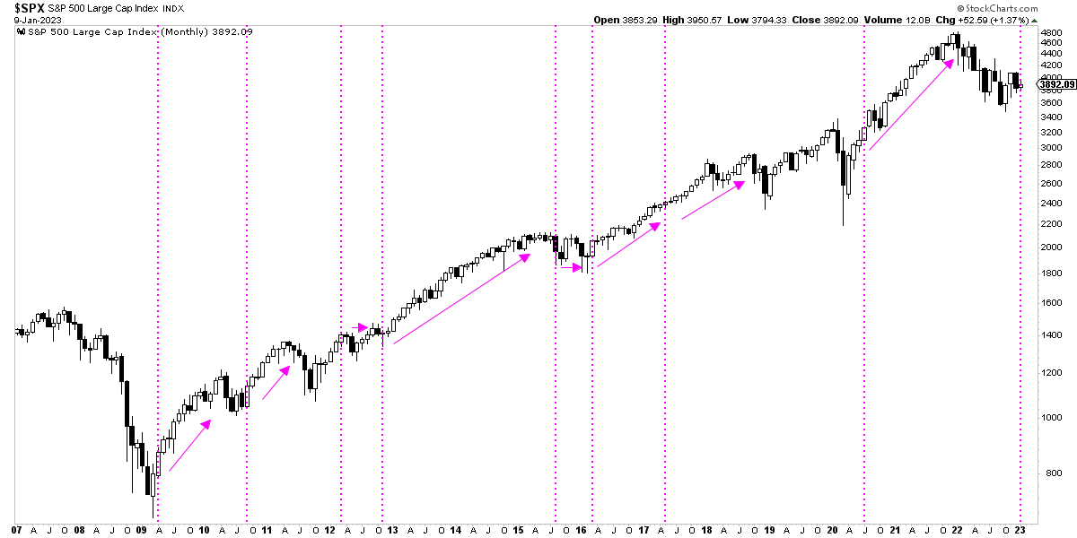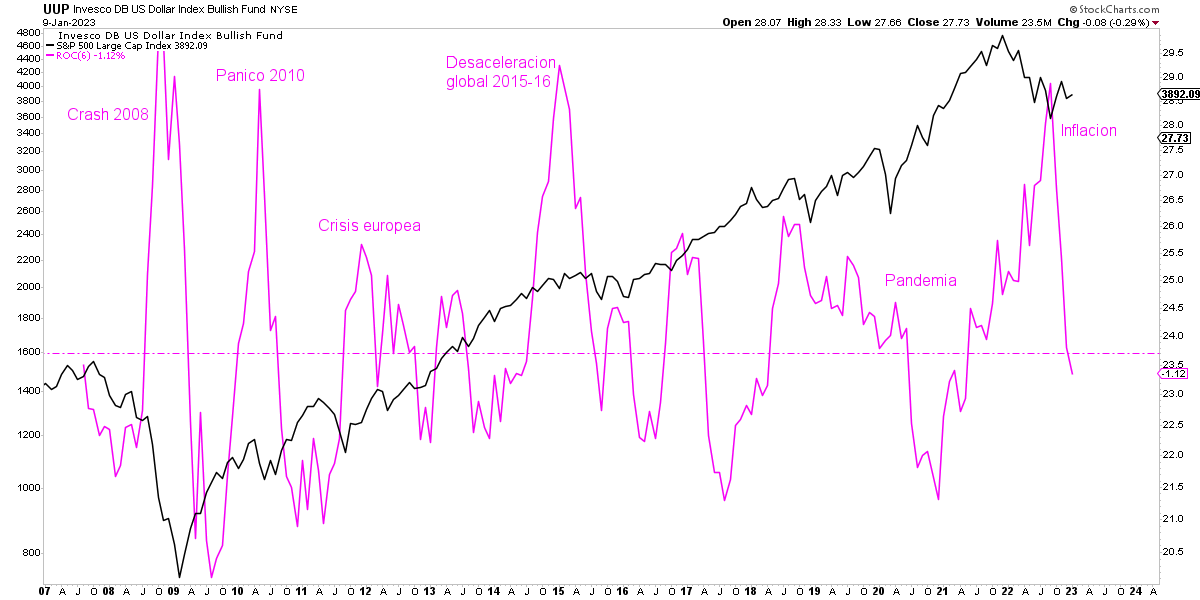 De hecho, en el siguiente gráfico he señalado los meses exactos en el S&P 500, en los cuales la tasa de cambio a 6 meses del dollar index se volvió negativa por primera vez. Como se puede ver, esto es algo que típicamente ocurre cuando las crisis comienzan a quedar atrás, a desinflarse.
