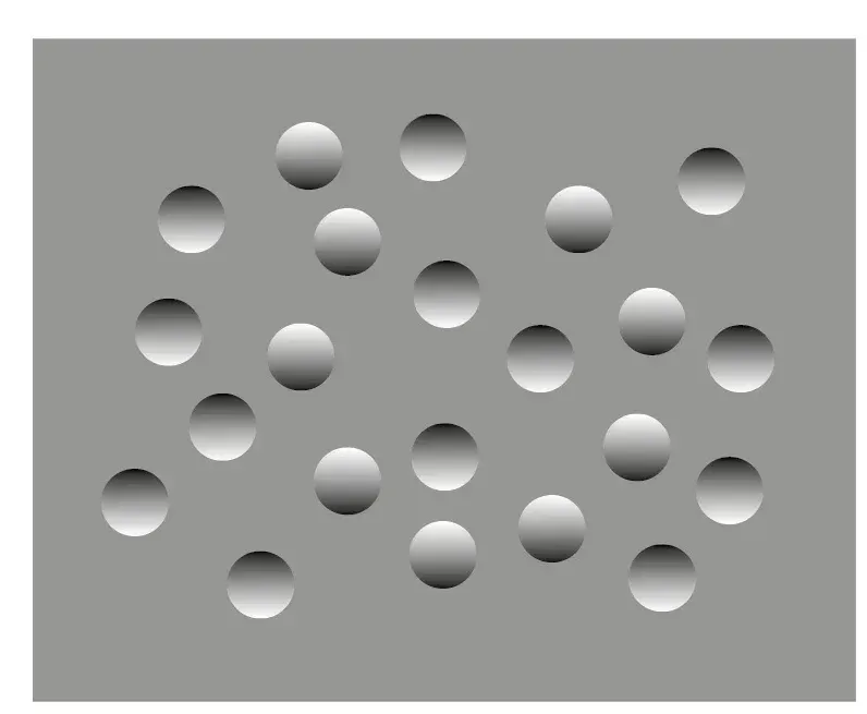 Ejemplos hay muchos, pero uno sencillo es el que ilustra la siguiente imagen, donde se representan círculos exactamente iguales coloreados con un gradiente que va desde blanco al negro. Los círculos que comienzan por arriba con el gradiente en blanco nos parecen esferas, mientras que que los círculos que empiezan desde el color negro, nos parecen cóncavos o huecos. Tanto es así que, si le damos la vuelta a la imagen, las esferas se convierten en huecos y los huecos en esferas. Nuestro cerebro simplemente ve esferas o huecos según como se presente la información.