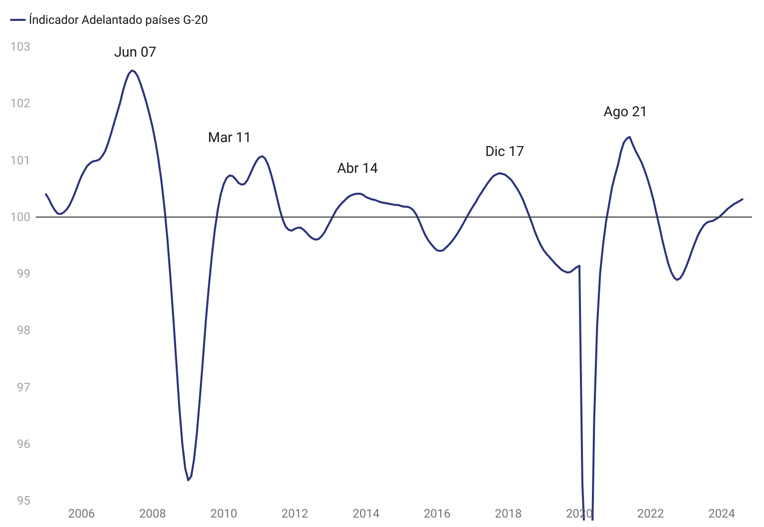 Por ello, no debe sonar extraño el que determine que es un signo claro de fin de ciclo, pero que a la vez necesito ver más cosas para dejar de ser alcista. ¿Y qué cosas son esas? No hay sorpresas. Primero que la actividad global, por ejemplo medida por el indicador adelantado de la OCDE de los países del G20, decline, queriendo decir que la actividad económica mundial está enfriándose.