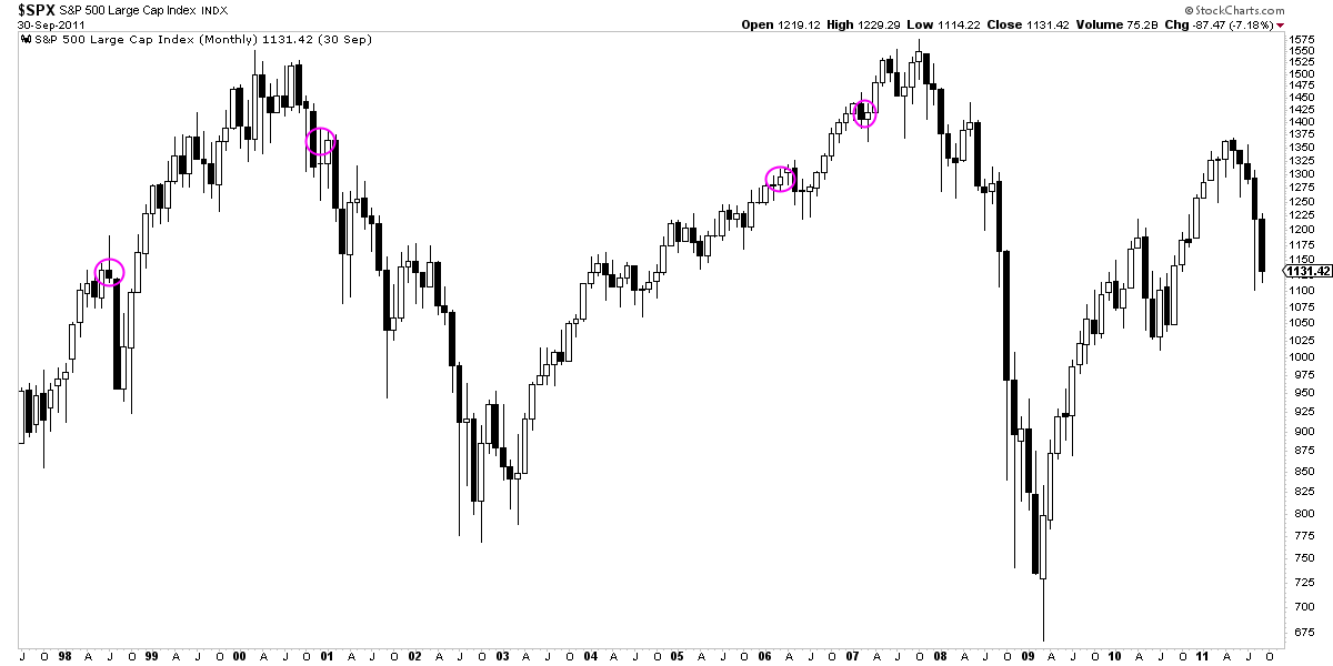 Luego, la siguiente desinversión de la curva de tipos en diciembre de 2000, lo que hizo es confirmar el mercado bajista iniciado pocos meses antes y, por tanto, fue una señal precisa de problemas en las bolsas. Como ven, el primer caso se adelantó 20 meses al fin del mercado alcista y la segunda sucedió 9 meses después de ese techo. Eso sí, una vez llegó el mercado bajista, éste fue intenso con caídas del -50% aproximadamente.