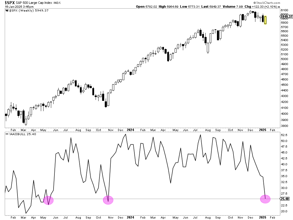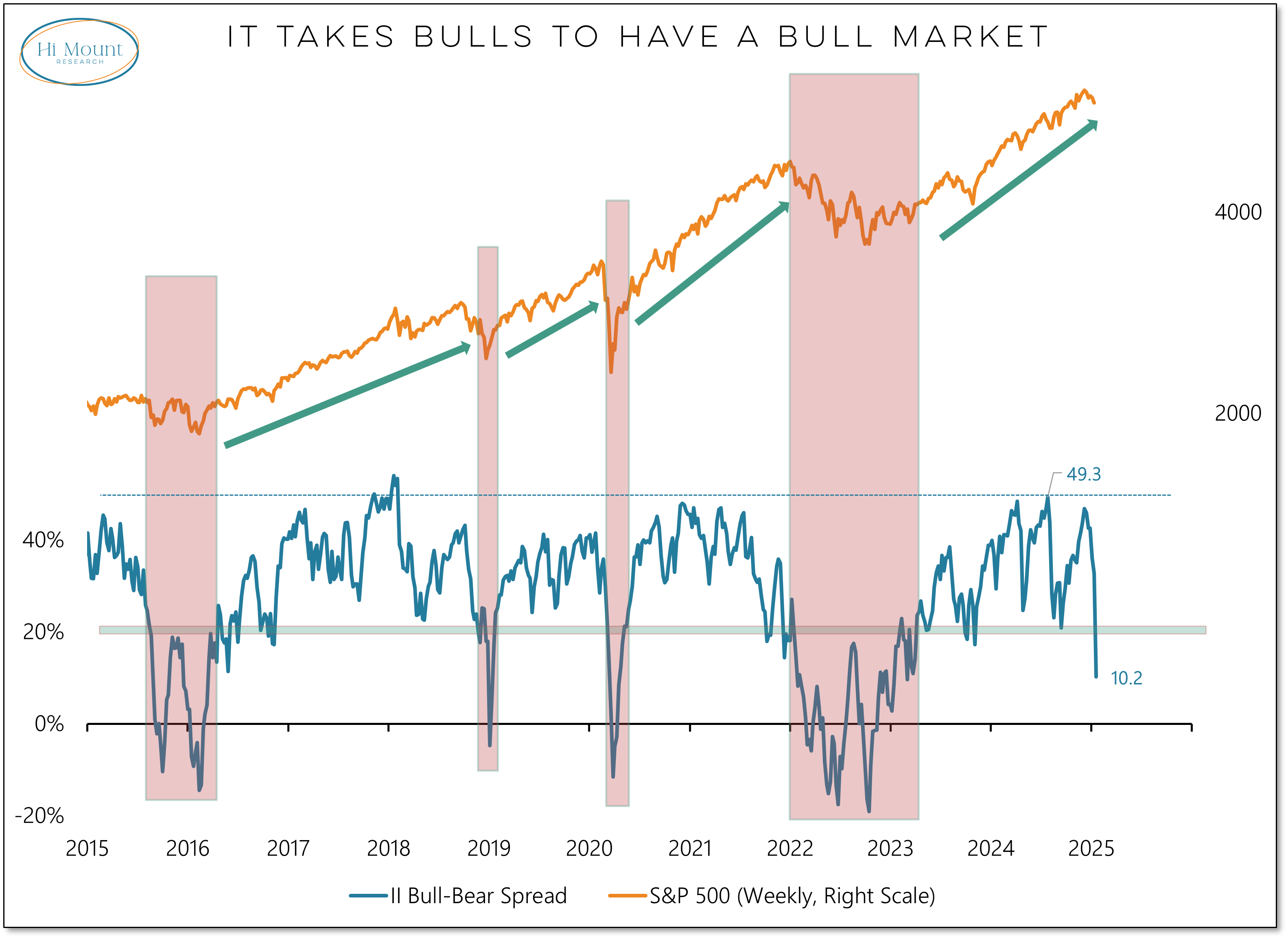 Por ejemplo, la encuesta de Investors Intelligence, en su diferencial de alcistas menos bajistas, se ha reseteado a niveles no vistos desde el año 2023 y se ha alejado de la zona de claro optimismo, algo que en mi opinión es un signo positivo de aquí en adelante, dado el contexto general de que estamos ante una economía que sigue expandiéndose.