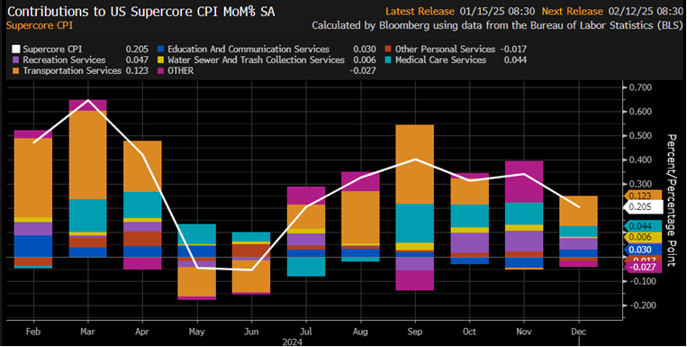 Otro elemento positivo ha sido que la inflación supercore del sector servicios, sector mayoritario en la economía estadounidense, y una medida que usualmente sirve para evaluar si la inflación en los salarios de dicho sector tienen riesgo de repuntar. La buena noticia es que en diciembre creció a una tasa moderada en términos históricos y recientes.