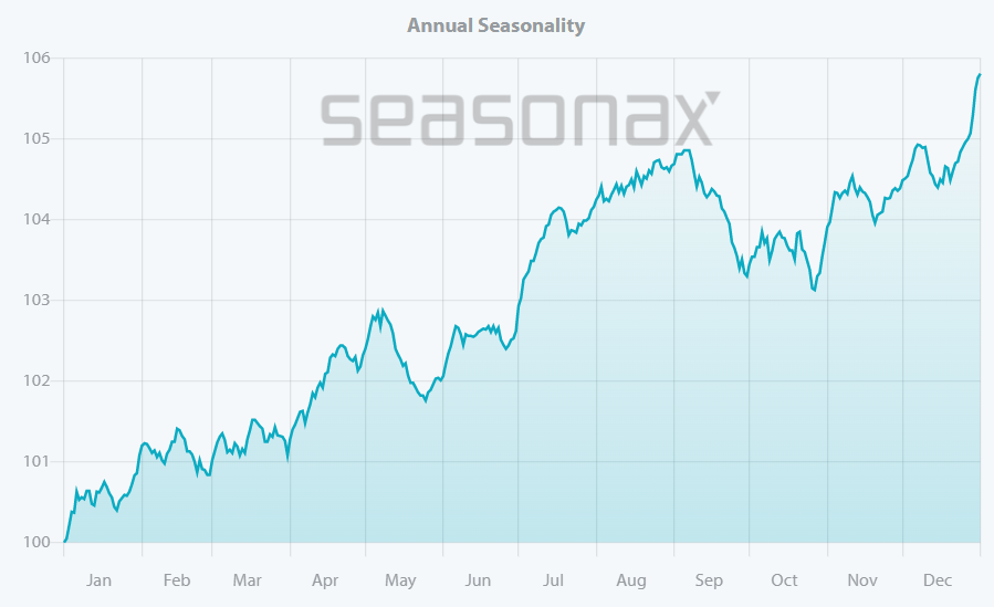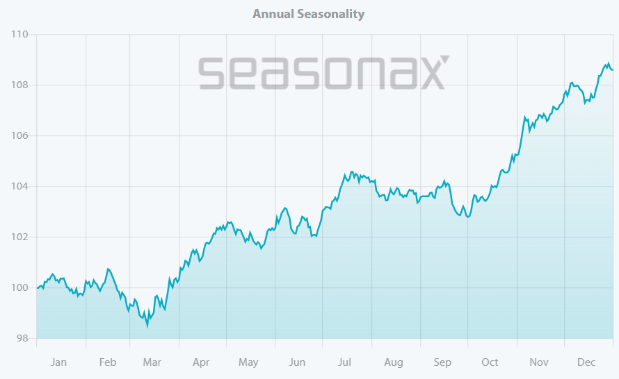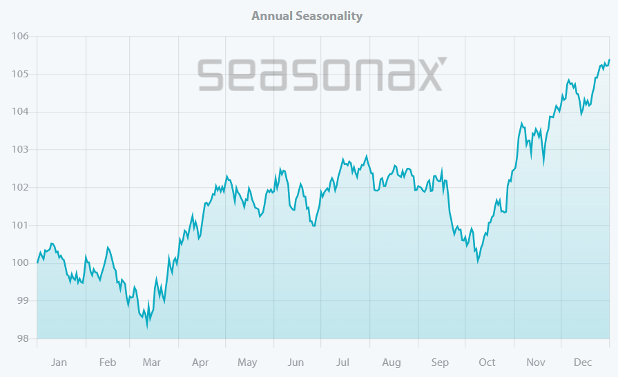 El otro problema con la supuesta estacionalidad negativa del S&P 500, es que desaparece por completo cuando se observa el máximo número de años posible, en este caso los 95 años que puede mostrar la web de Seasonax.