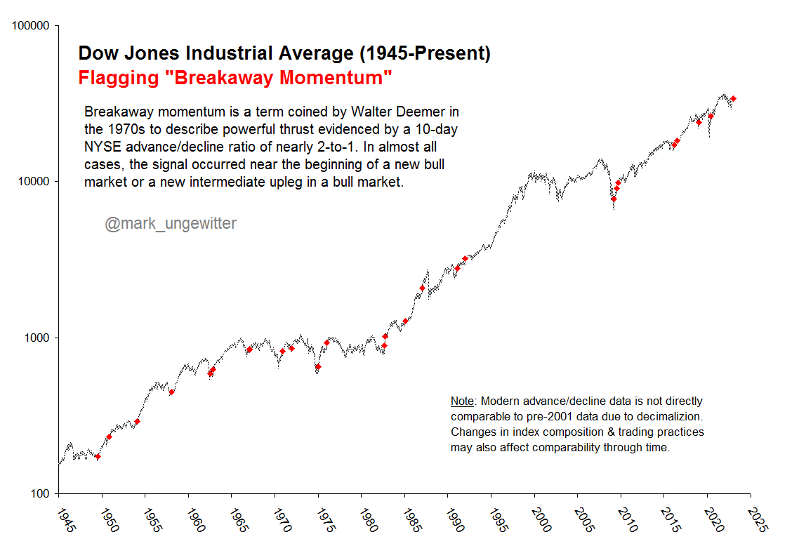 Esto es algo que ocurre muy pocas veces en la historia y que suele darse al comienzo de los mercados alcistas o en continuaciones de los mercados alcistas. En la siguiente tabla podemos ver todas las fechas en las que se produjo una señal positiva de este indicador desde la II Guerra Mundial.