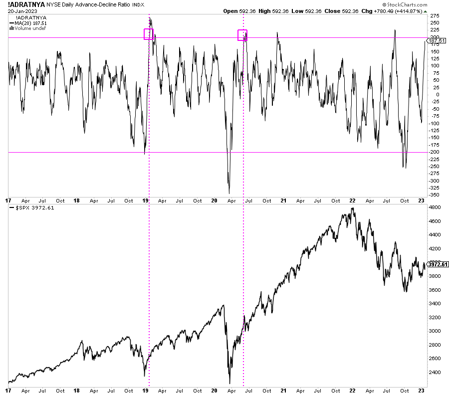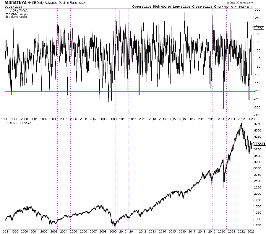 Este es un indicador que se activa al comienzo de los mercados alcistas y de los movimientos secundarios alcistas más relevantes. Al fin y al cabo, refleja cuando la mayoría de acciones avanzan o retroceden en un sentido u otro.