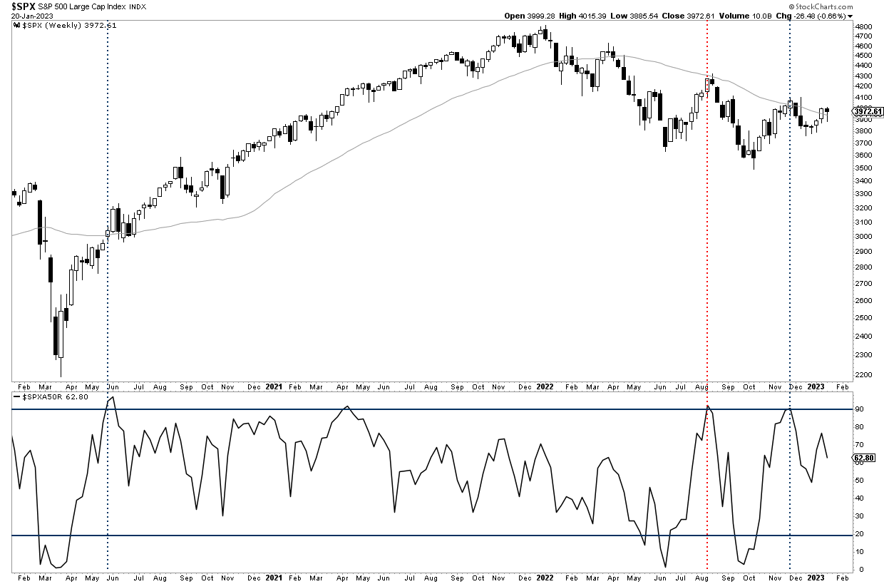 Así, el pasado 4 de diciembre expliqué aquí en el Club, que aparte de que la inflación estaba mejorando de forma clara, el principal indicador de amplitud que utilizo se había vuelto positivo. Es decir, más de un 90% de las acciones componentes del S&P 500 se encontraban sobre sus propias medias de 50 sesiones, algo que ocurre al comienzo de los mercados alcistas con pocos errores en la historia.
