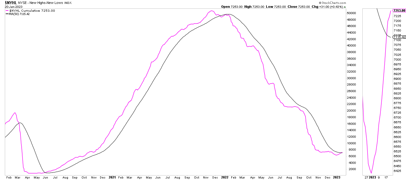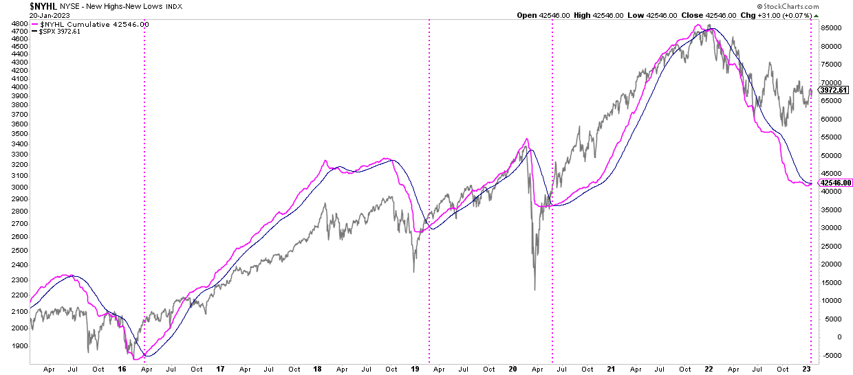 Lo interesante de la semana pasada es que se ha activado el otro indicador de amplitud que traté en aquella primera Masterclass, en concreto el indicador de nuevos máximos menos nuevos mínimos de la bolsa de Nueva York y que en el siguiente gráfico vemos representado por su forma acumulada a lo largo del tiempo junto con su propia media de 50 sesiones.