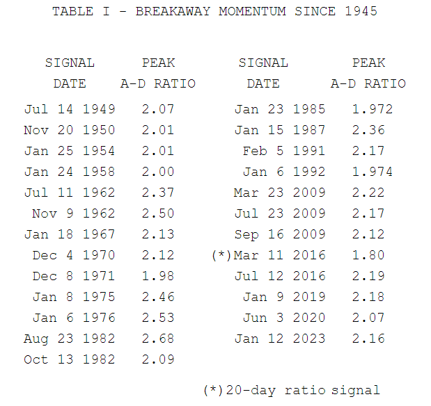 Se trata del Breakaway Momentum de Walter Deemer, una variación no muy lejana del indicador que acabamos de ver, donde durante 10 días se tiene que mantener el ratio de acciones al alza con respecto de las acciones a la baja, por encima de 2:1. Es decir, tiene que producirse un "momentum sostenido en el tiempo".