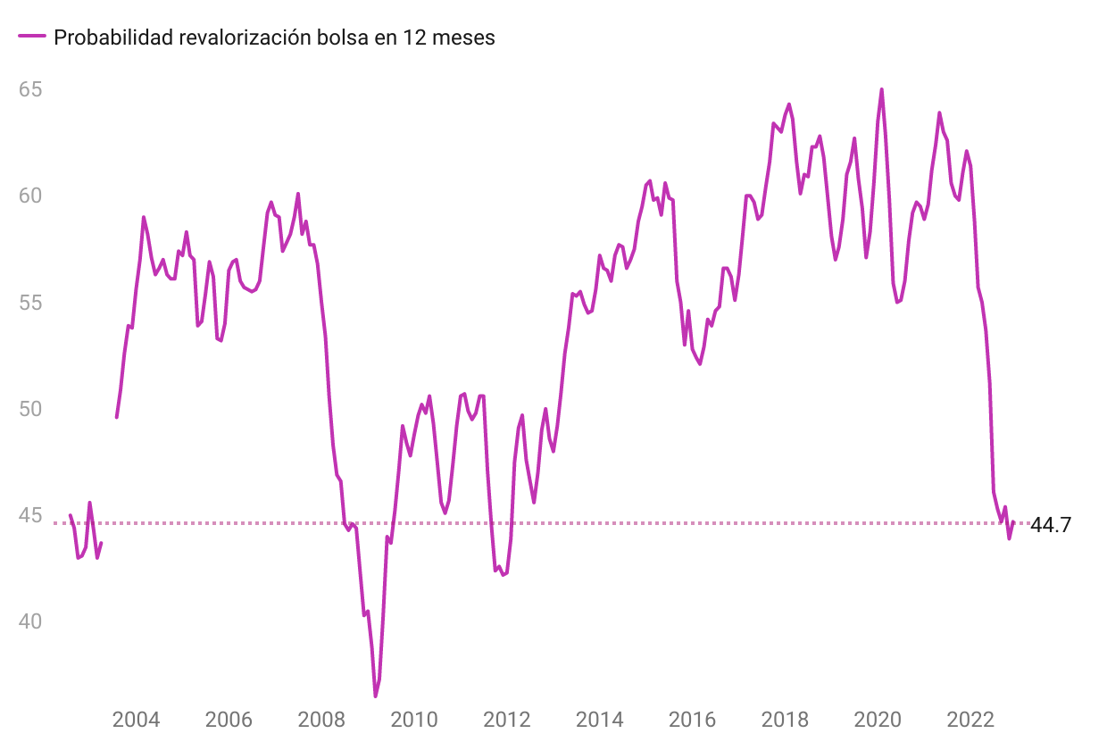 Actualmente, la probabilidad media que le asignan los consumidores a que la bolsa se aprecie el próximo año es del 44,7%, uno de los niveles más bajos de toda la serie.