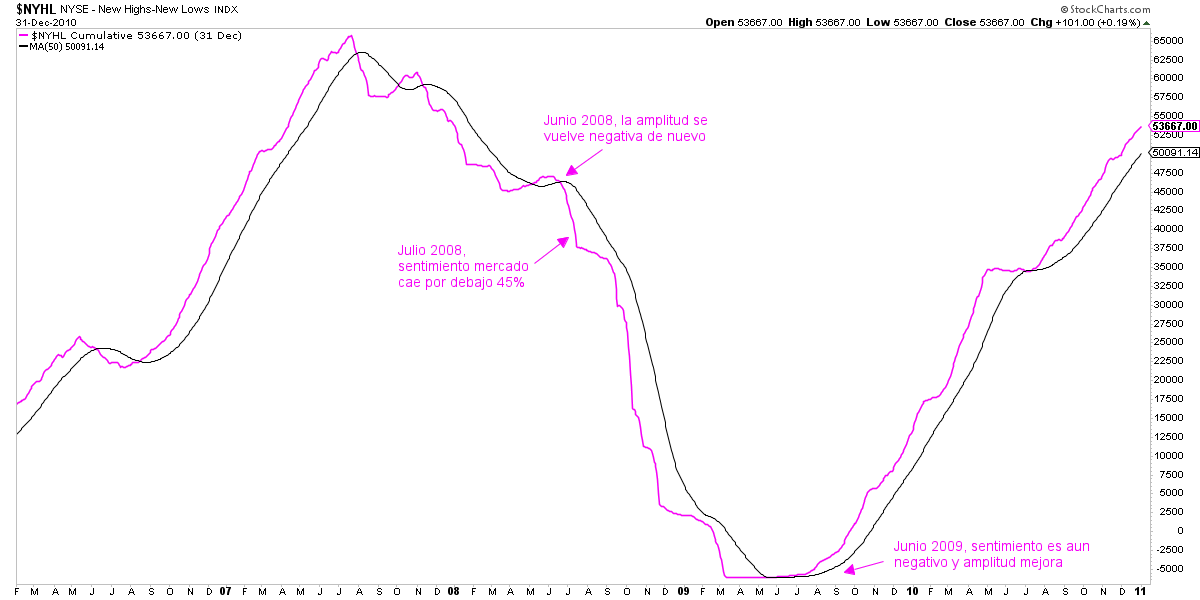Sin embargo, un año después, en junio de 2009 (ver anterior gráfico), la amplitud de mercado superó su propia media de 50 sesiones, señalando que el conjunto del mercado estaba apreciándose. Cuando eso ocurre y además te das cuenta de que el sentimiento de mercado sigue siendo de extremo pesimismo (<45%), lo normal es que estés ante una oportunidad de gran probabilidad, donde el comportamiento técnico del mercado es positivo y el sentimiento es muy negativo.