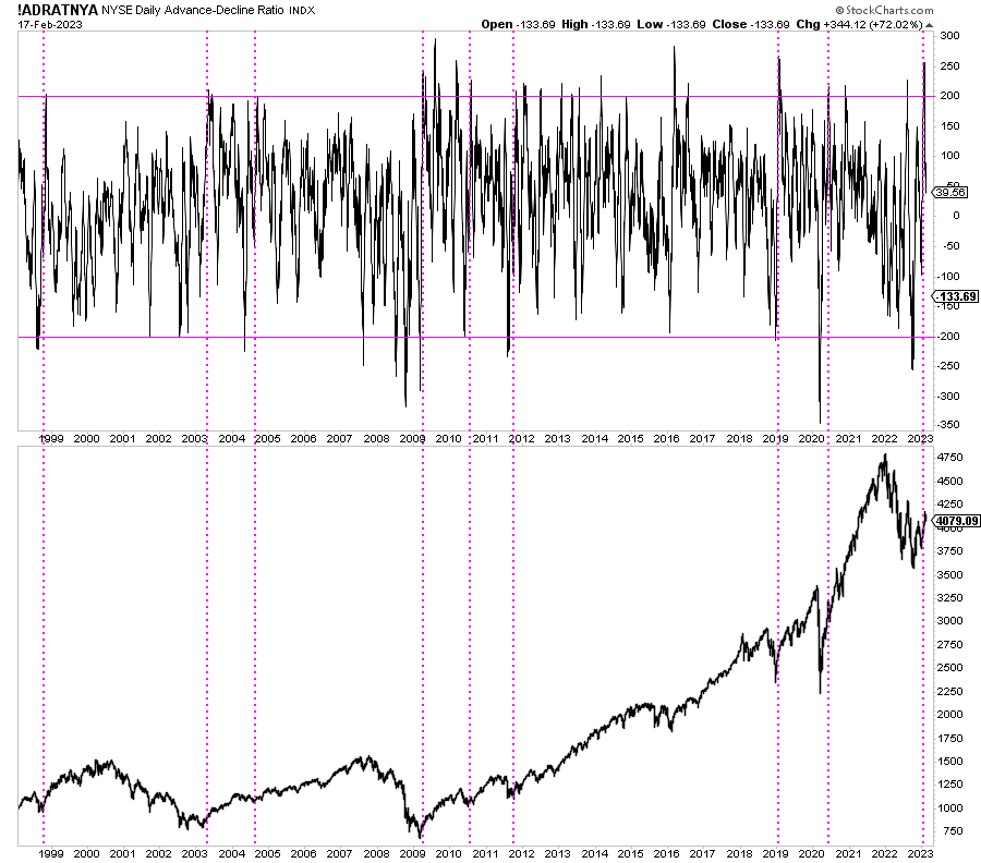 Son las mismas señales de amplitud, sin duda, pero observarlo junto con el sentimiento te da un mayor sentido del ciclo, de donde se está (probabilísticamente hablando) y de que probablemente esta vez tampoco será diferente. Que, de hecho, no hay mejor combinación posible entre un sentimiento en la calle muy pesimista y un conjunto del mercado subiendo, como muestro en el siguiente gráfico donde sólo se ven señales de amplitud que coinciden con un extremo de pesimismo.