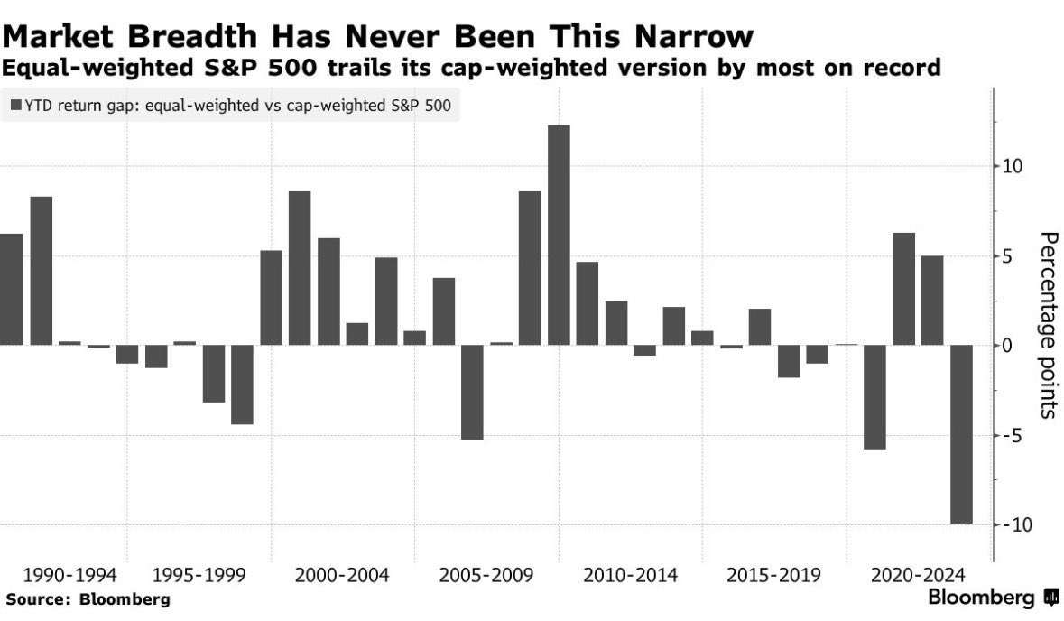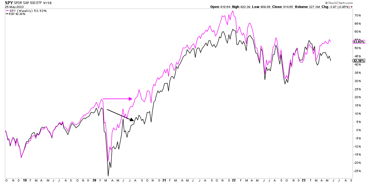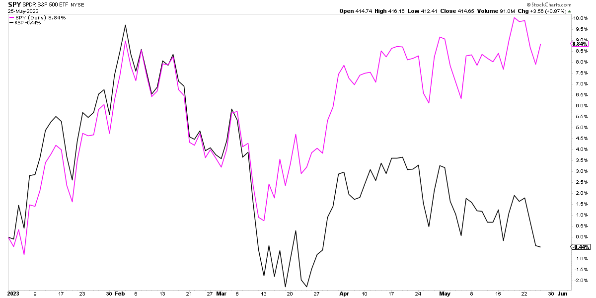 A cierre del pasado jueves el ETF "SPY", que replica al S&P 500, se apreciaba un +8,84% en lo que va de año. Nada mal para los primeros cinco meses de un año en el que el consenso de los analistas esperaba un año bajista. Sin embargo, el ETF "RSP", que replica a los componentes del índice S&P 500 pero de forma equiponderada, es decir, dándoles el mismo peso en cartera a cada valor sin importar su capitalización de mercado, registra una pérdida del -0,44%, mostrando una de las mayores divergencias de las últimas décadas.