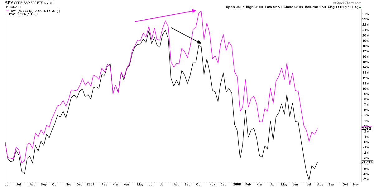 Los pesimistas resaltan sobremanera la actual divergencia porque les recuerda a la que se produjo en octubre de 2007, cuando el S&P 500 (SPY) alcanzó un nuevo máximo, mientras que el índice equiponderado (RSP) no lo logró hacerlo, algo que ocurrió en la antesala del gran mercado bajista de 2008.