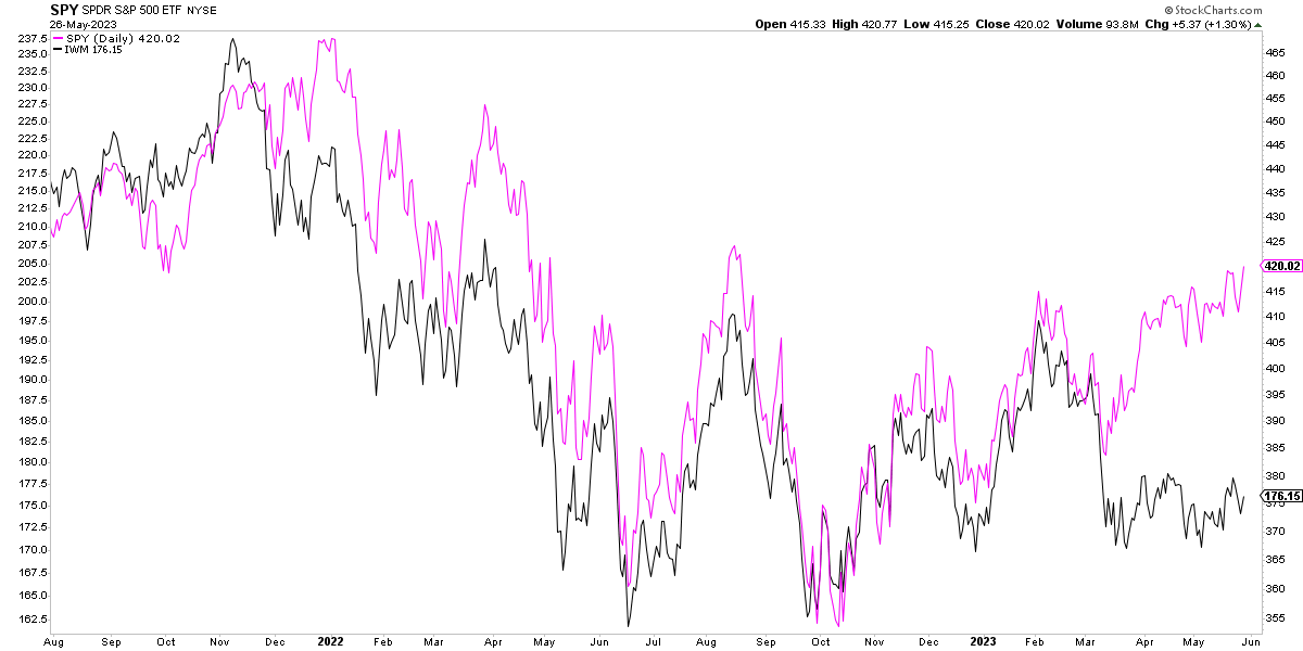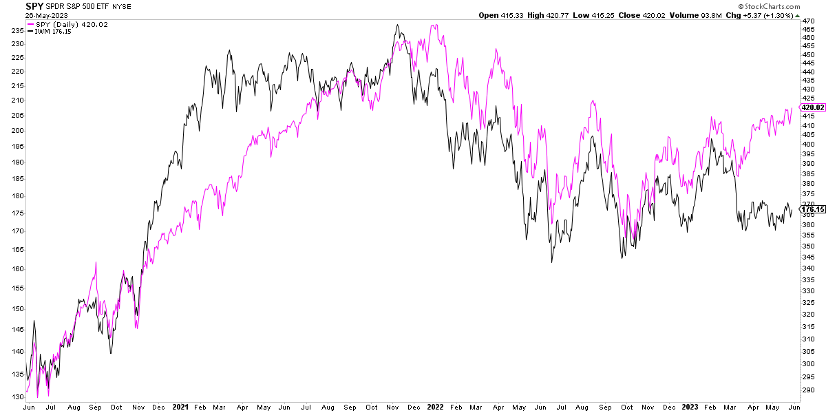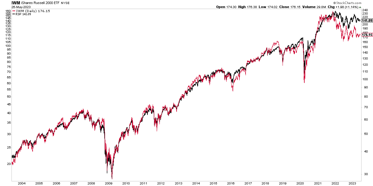 Ahora bien ¿por qué se producen estas divergencias? Hay que entender que esencialmente lo que se llama "amplitud de mercado" es casi sinónimo de medianos y pequeños valores. Por ello, el comportamiento del S&P 500 a través del ETF RSP es casi idéntico al comportamiento del ETF IWM que replica el índice Russell 2000 de valores de pequeña capitalización. Tanto que ambos muestran las mismas divergencias con respecto al S&P 500: declinaron antes en 2007, tardaron más en subir en 2011-12, también en 2020, al igual que en el caso actual donde los dos índices andan rezagados.