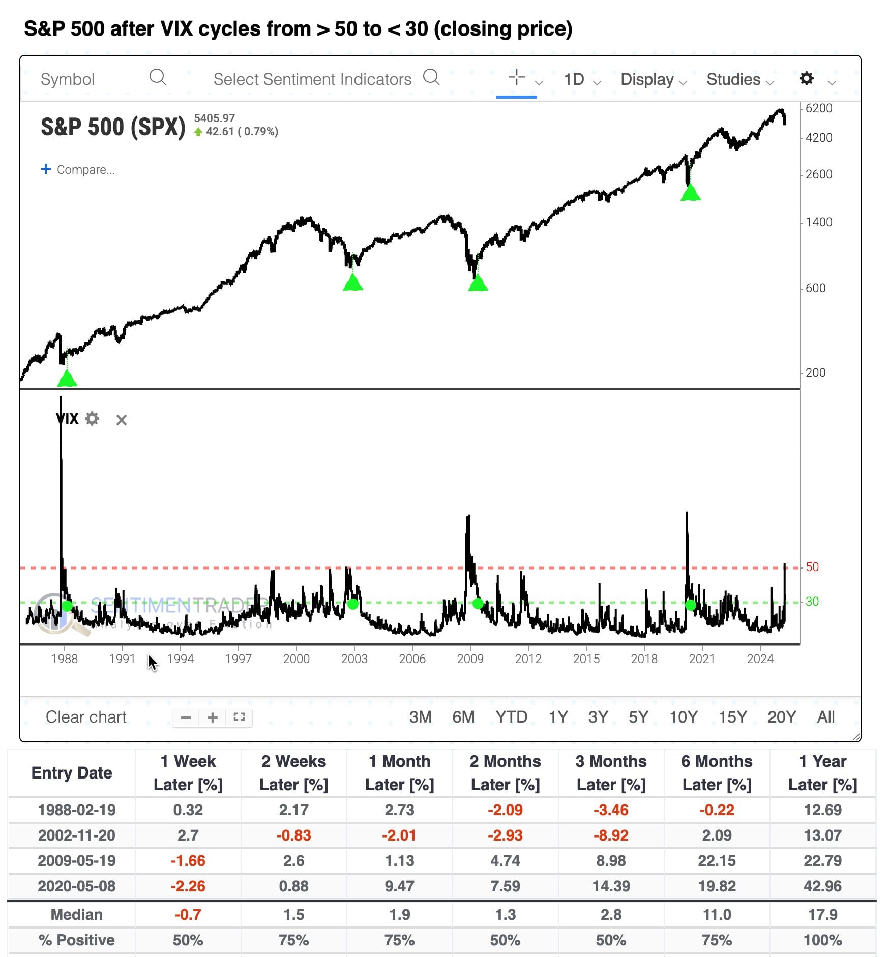 En tercer lugar, porque en esa estadística del VIX, su creador ha decidido que solo valen las lecturas sobre 50% a fin de día, ignorando las lecturas que en intradía superaron ese nivel. Un ejemplo muy reciente lo tenemos en agosto de 2024, donde el VIX llegó a alcanzar el 65,73%. Sí, el mercado se recuperó en los siguientes 4 o 5 meses, pero sólo 8 meses después estamos más abajo, no habiéndose dado una tendencia sostenible a medio plazo (o al menos es un ejemplo muy diferente de los que sugiere la primera estadística del VIX, con tendencias de varios años de extensión).
