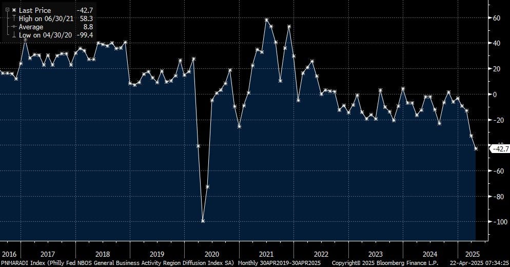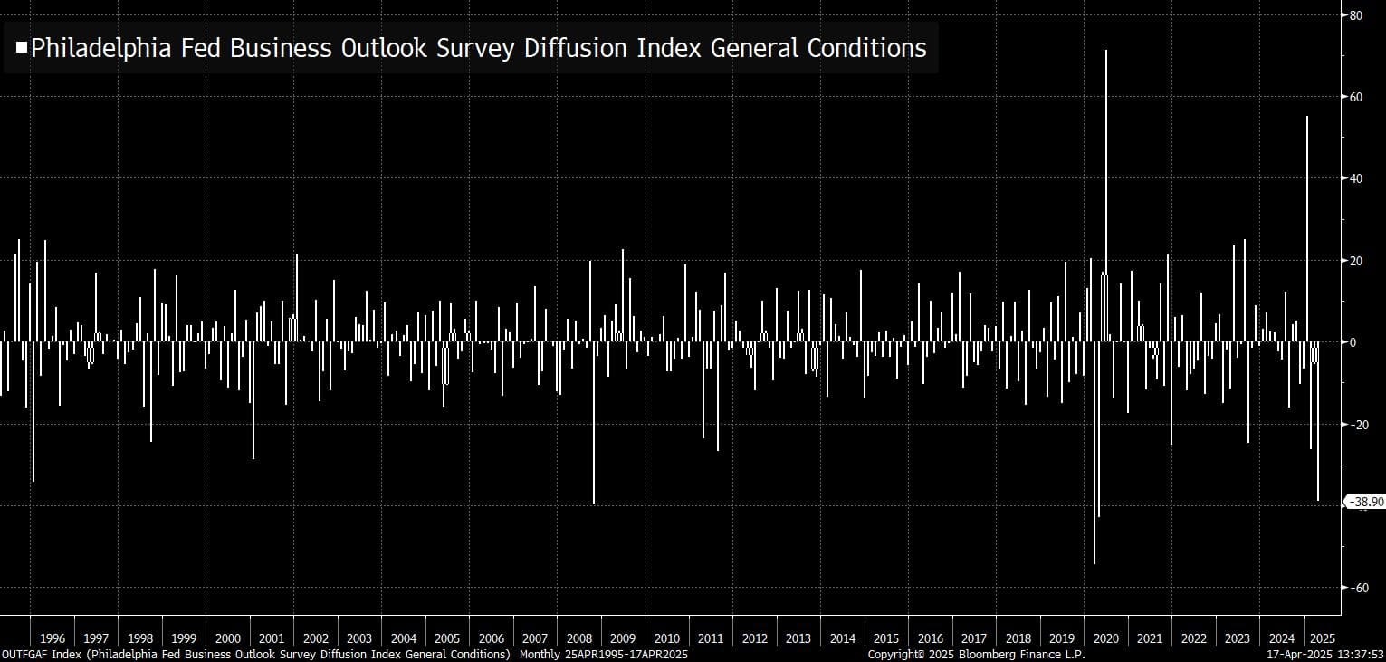 Por ejemplo, la caída de los indicadores de actividad económica de una encuesta de situación como la de la Reserva de Filadelfia, ha mostrado su tercera peor caída de los últimos 30 años, a la par que 2008 o 2020. Por supuesto, no estoy igualando 2025 con aquellos episodios, pero la repentina caída de las condiciones económicas muestran que muy posiblemente algo se ha roto estos días y puede traer graves consecuencias económicas.