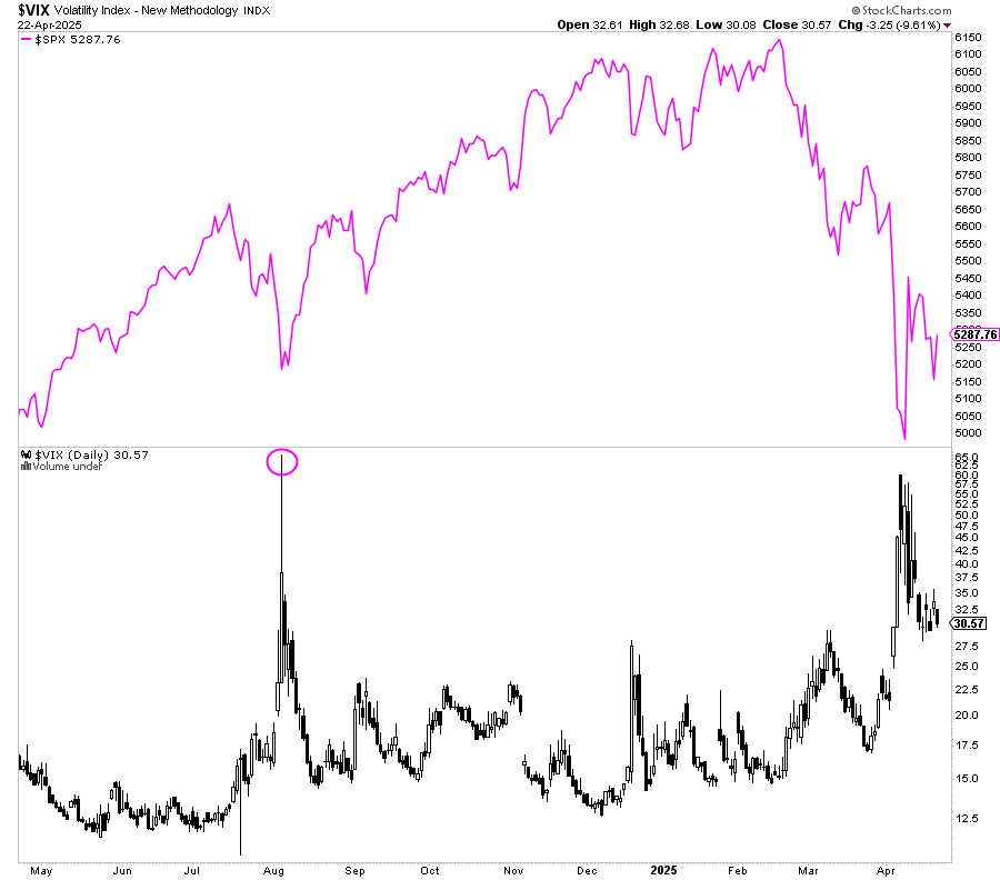Si volvemos de nuevo al ejemplo de agosto de 2024, donde la lectura del VIX (65,73%) superó a la lectura del VIX (60,13%) durante el crac bursátil de abril de 2025, y donde las circunstancias macro sí son realmente graves con elevado riesgo de mercado bajista, se demuestra fácilmente que un determinado nivel del VIX no lo es todo.