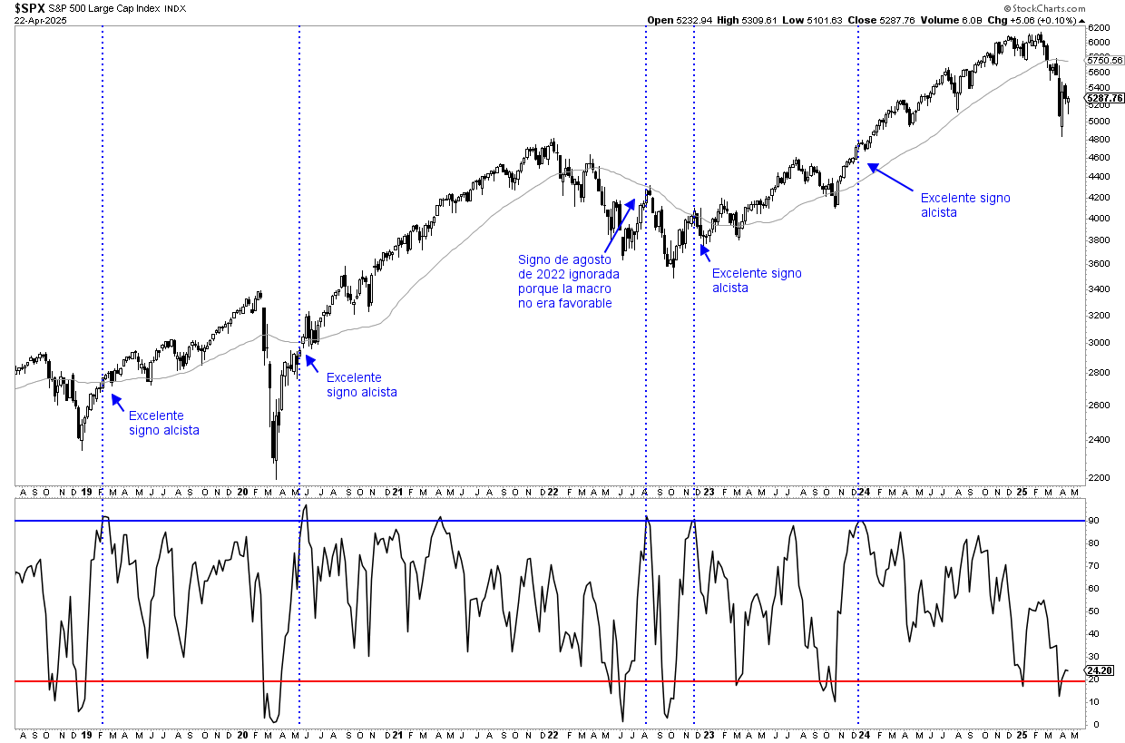 En aquella ocasión de agosto de 2022, afortunadamente, esa señal la ignoramos porque no estaba de acuerdo a mi análisis de la situación macroeconómica (la inflación no se había moderado según mi definición) y solo tomamos como señal válida de impulso de amplitud, la del cierre de noviembre de 2022, porque ahí sí estaba de acuerdo a mi interpretación de la situación del ciclo económico-bursátil, lo que me llevó a escribir, aquí en el Club, el análisis de que probablemente estábamos entrando en un nuevo mercado alcista, como así fue.