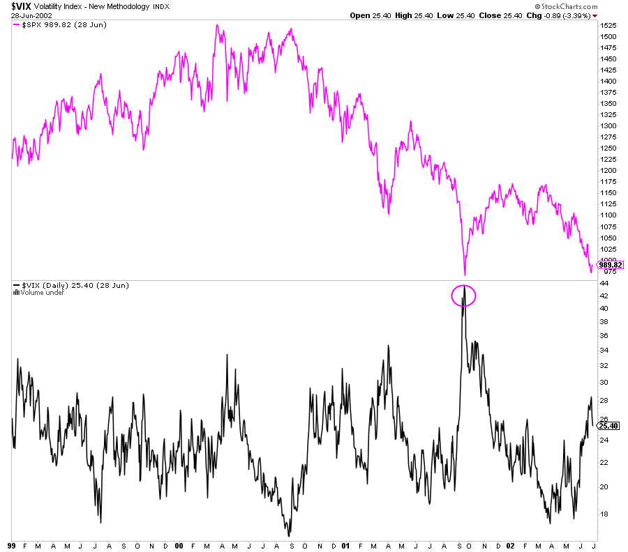 En el caso de la estadística del VIX, la cual aporta mucha más información causal, ya que el comportamiento social humano es cíclico y después de la tormenta casi siempre llega la calma, tiene varios peros. Primero, el número de casos (4) es demasiado escaso como para poderlo tomar en serio. En segundo lugar, hay lecturas que por los pelos no llegaron a 50% y después de bajar al 30% las bolsas siguieron declinando (2001)