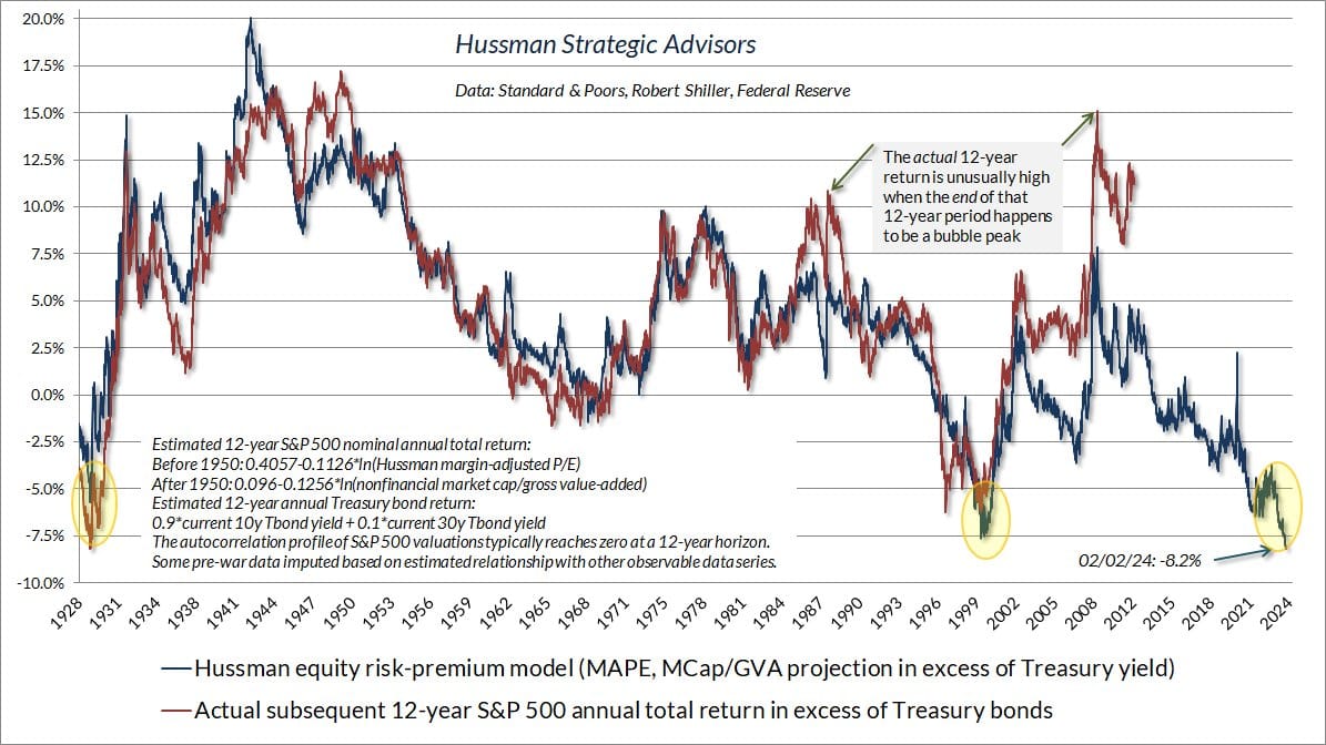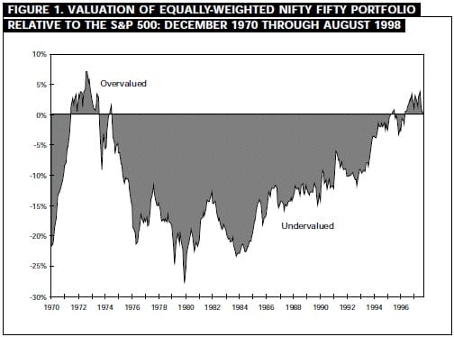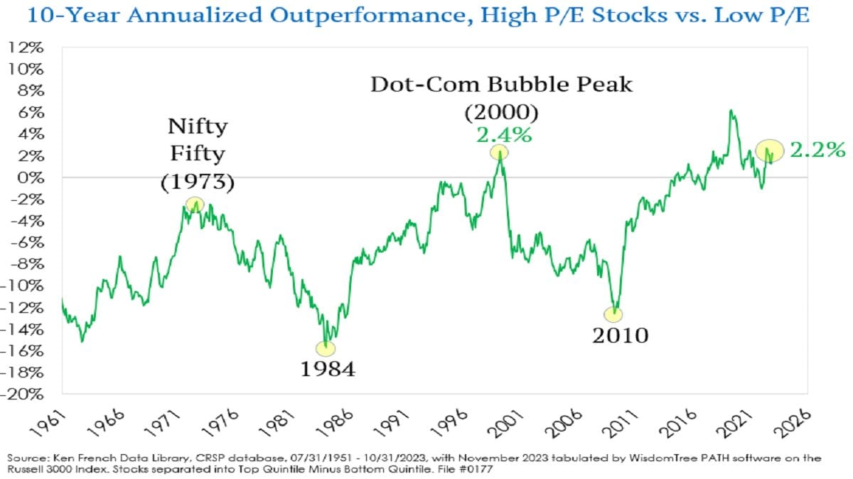 Desde este punto de vista, estamos en un proceso similar al de los alrededores de 1973 (burbuja Nifty Fifty) y la burbuja "puntocom" del año 2000. Sin embargo, descarto que el caso actual sea algo parecido a la de 2000 porque aquella burbuja estaba dominada por empresas sin beneficios, mientras que la burbuja de la Nifty Fifty se dio con empresas maravillosas pero por las que se llegó a pagar demasiado.