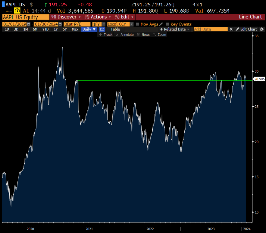 Con el rally experimentado en el actual mercado alcista cíclico nacido en octubre de 2022, valores como Apple han vuelto a niveles muy exigentes en valoraciones, con un PER 28,90, casi tanto como el alcanzado durante la manía alcista de 2021 cuando se lanzaron importantes bazucas monetarios y fiscales para salvar a la economía de los forzados confinamientos pandémicos.