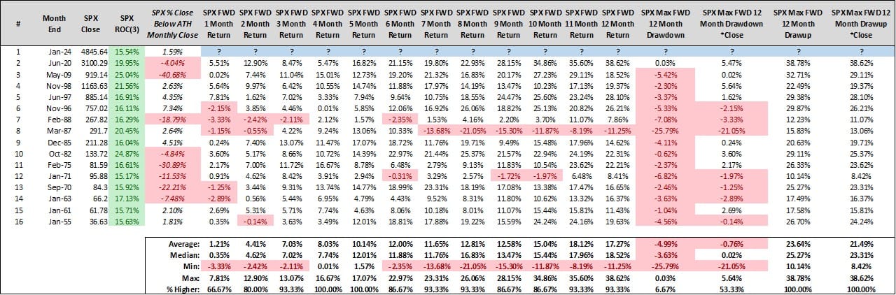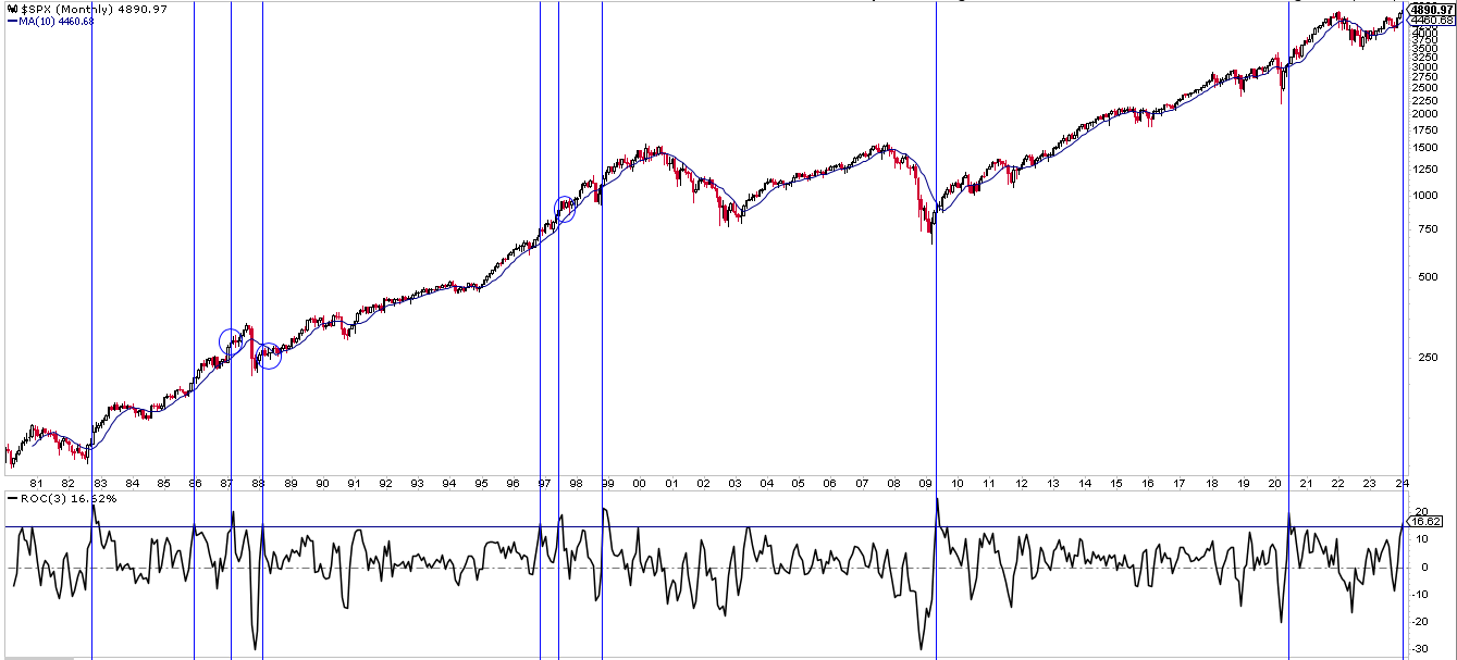 Observando lo mismo pero ahora en un gráfico del S&P 500 y referido a las últimas cuatro décadas, vemos que esos momentos suelen darse al comienzo de nuevos mercados alcistas o de continuación de los mismos. Es raro ver ese momentum tan elevado al final de un mercado alcista o antes de un crash. De hecho, solo se produjo un evento negativo de rentabilidad a doce meses en 1987 y aún así el mercado continuó subiendo un semestre más antes de que comenzaran las caídas.