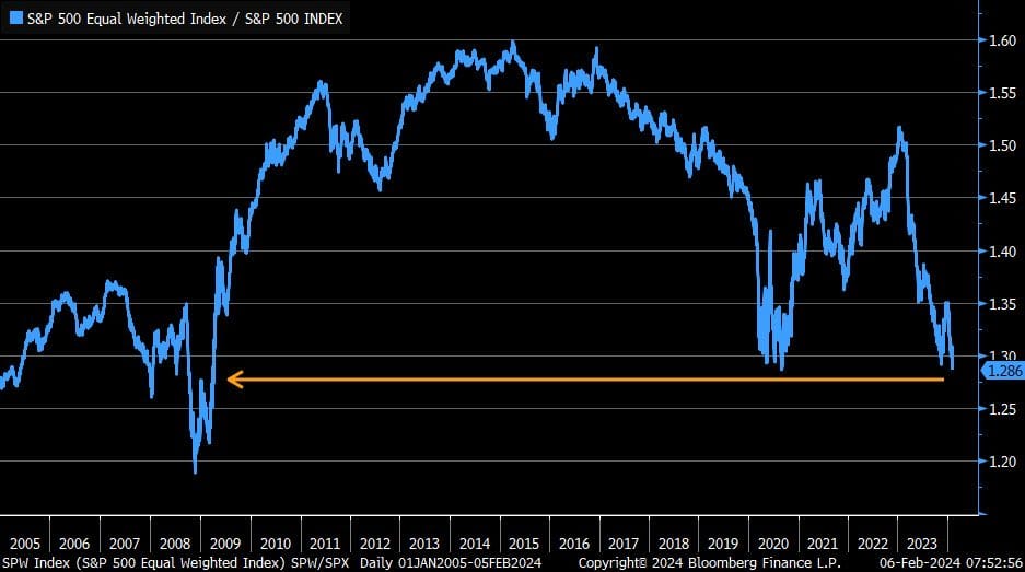 Es por esto que el conjunto o amplitud del mercado lo está haciendo tan mal con respecto al índice S&P 500. De hecho, no se veía un desempeño relativo tan malo desde la burbuja de 2000.