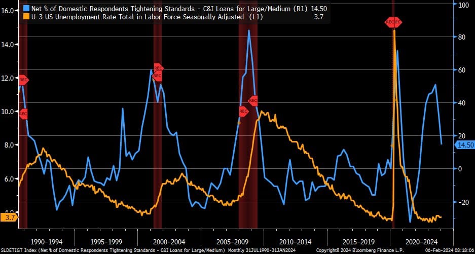 Se podrían sacar muchas fotos o ángulos de este soft landing conseguido, pero quizás una de esas mejores fotos puede ser el comparar la tasa de paro en Estados Unidos y la evolución del crédito. Ya se ha empezado a observar como los bancos están siendo menos duros a la hora de prestar, algo que es muy típico de haber dejado atrás una recesión económica, y todo eso mientras el paro no ha repuntado significativamente.