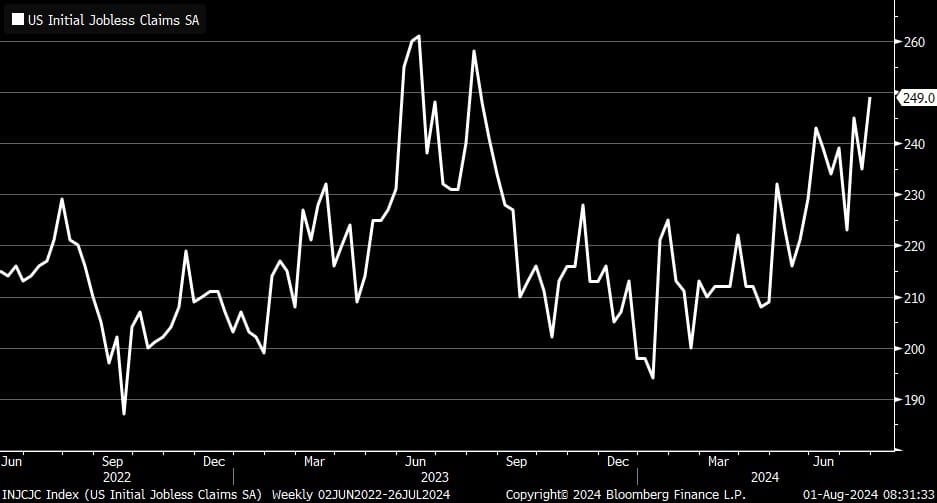 Y, por si fuera poco, el dato de nuevas solicitudes de ayudas por desempleo (initial claims) lleva repuntando algunos meses, hasta las 249.000 solicitudes por mes y parece estar acelerándose. Este es un indicador muy seguido por el mercado, reconocido como buen indicador líder y, que si sigue repuntando en las próximas semanas, podría seguir elevando las alarmas ya existentes.