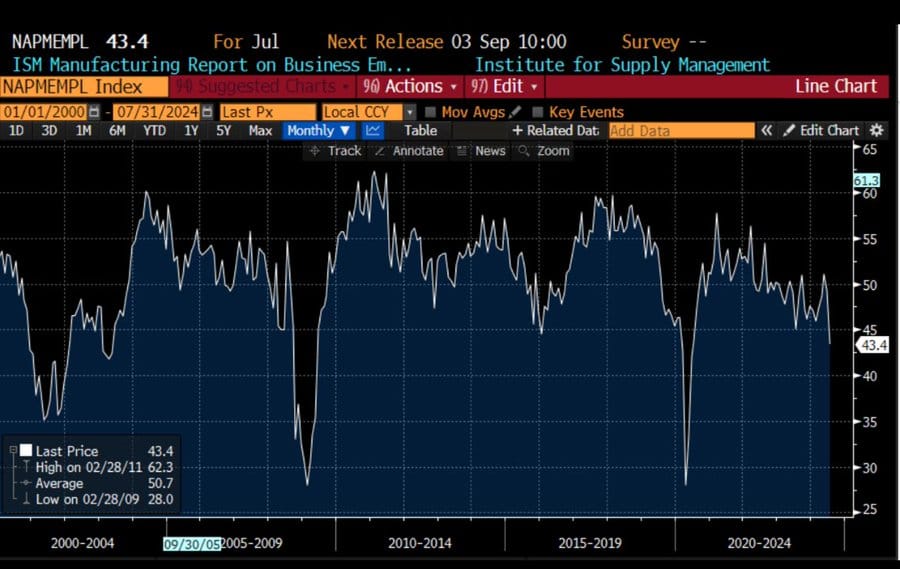 Lo que realmente está pasando es que el mercado se ha asustado con dos datos de empleo, tras decir la FED que, por lo que sea (*), está vigilando de cerca el mercado laboral porque, se sobreentiende, le ha empezado a preocupar. Y este es el gran tema y lo que está moviendo los mercados globales, más allá de algunos excesos como el experimentado por el índice Nikkei 225 o el índice VIX.
