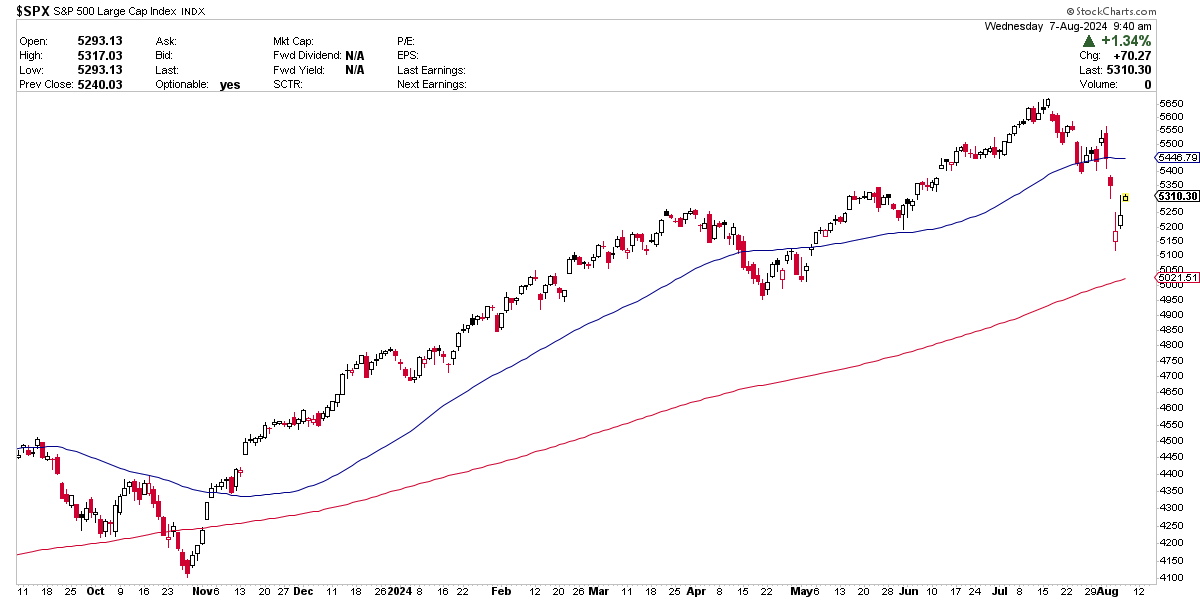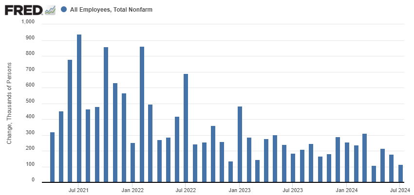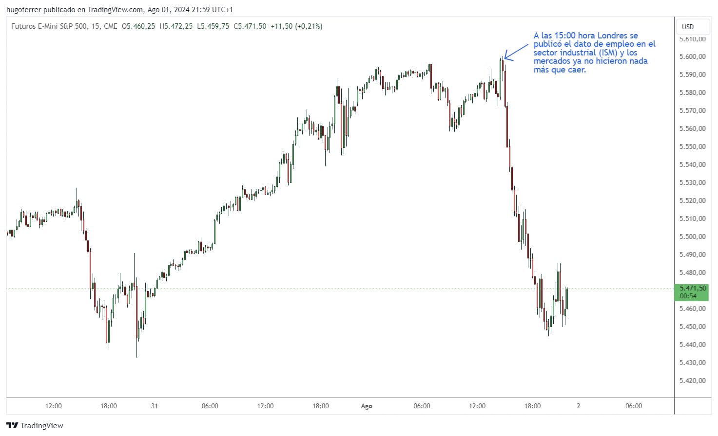 Pero como este dato se conoció tras el "giro" de la FED en el día previo, desde su obsesión por la inflación hacia su preocupación por la evolución del mercado laboral, este dato claramente negativo fue la gota que colmó el vaso y a partir de ese momento los mercados ya no se recuperarían. Al día siguiente, 2 de agosto, con los mercados ya muy débiles se conoció el dato oficial de empleo del mes de julio, el cual mostró otra sorpresa negativa al haberse creado sólo 114.000 empleos en vez de los 176.000 esperados. Ese día 2 de agosto, el mercado cerró con otra pérdida del -1,84%.
