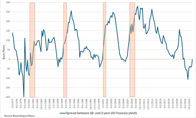 Otro dato macro relevante de estos momentos es que la curva de tipos está a punto de desinvertirse, un fenómeno que correlaciona muy de cerca con el comienzo de las recesiones, dado que cuando la curva de tipos se desinvierte suele ser porque el mercado de bonos ha comenzado a cotizar que los tipos de interés a corto plazo serán mucho más bajos que los tipos de interés a largo, algo típico de las fases recesivas de la economía.