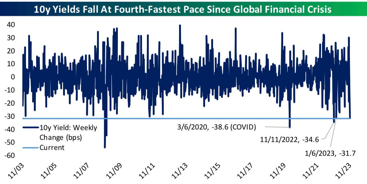 Las subidas de la pasada semana no se dieron en el vacío, sino como respuesta simultánea a una caída intensa del yield de los bonos, una de las mayores caídas de las últimas décadas como podemos ver en el siguiente gráfico.