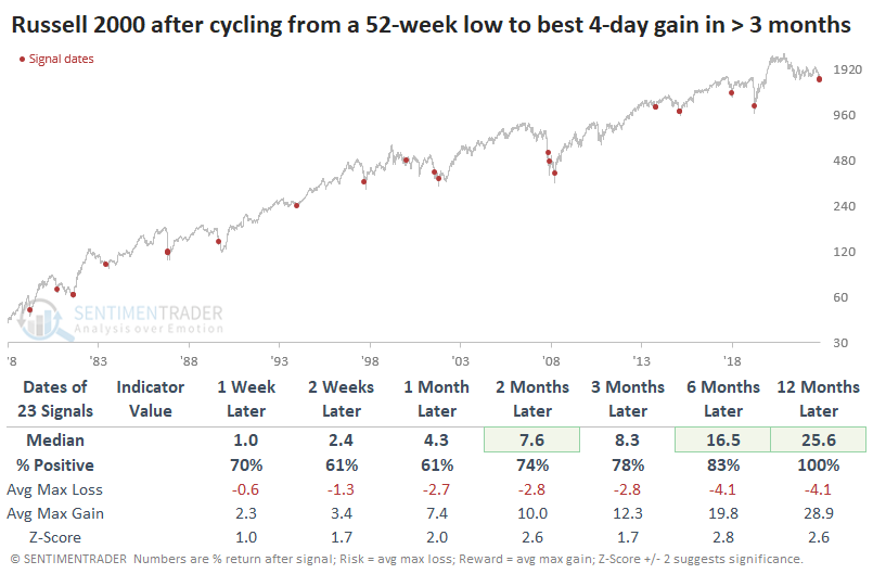 Y todavía más interesante y que añade un ángulo nuevo, es que cuando el Russell 2000 se encuentra en mínimos de 52 semanas -o mínimos de un año- y de repente experimenta un estupendo rally de 4 días que es el de mayor magnitud en al menos los últimos 3 meses, eso suele ser típico de suelo de mercado o muy cerca de un suelo de mercado. En los últimos 45 años el mercado estaba más arriba un 83% de las veces sólo 6 meses después.
