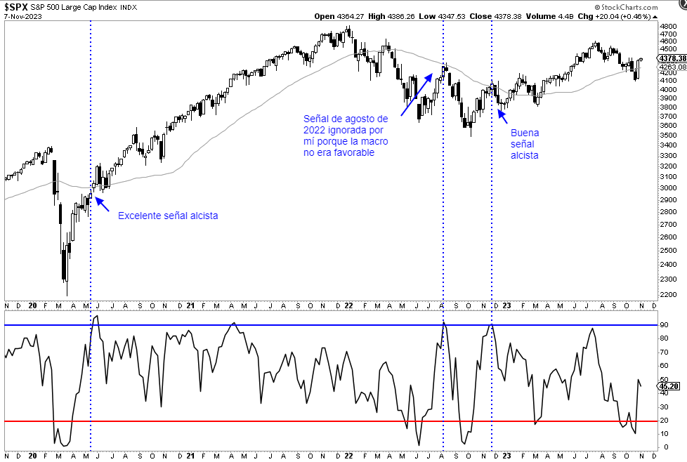 Dado el casi excelente historial que lleva acumulado este indicador y otros similares durante las últimas décadas -siguiente gráfico-, no es de extrañar que al cierre del viernes hubiese gran optimismo entre la comunidad de inversores que siguen los conceptos de momentum y de amplitud.
