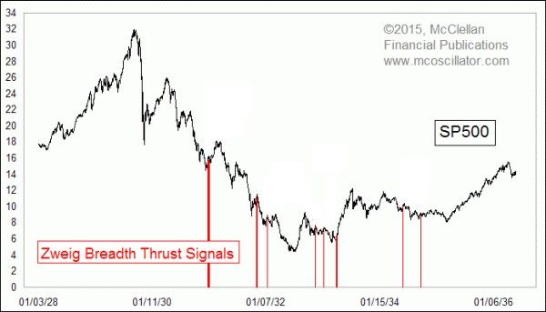 Esa señal alcista de la amplitud, conocida en inglés como Zweig Breath Thrust, se genera cuando el mercado pasa de una situación de amplitud extremadamente negativa hasta una situación contraria extremadamente positiva en un muy corto periodo de tiempo, reflejando así que se ha producido un cambio de fondo en la naturaleza del mercado.