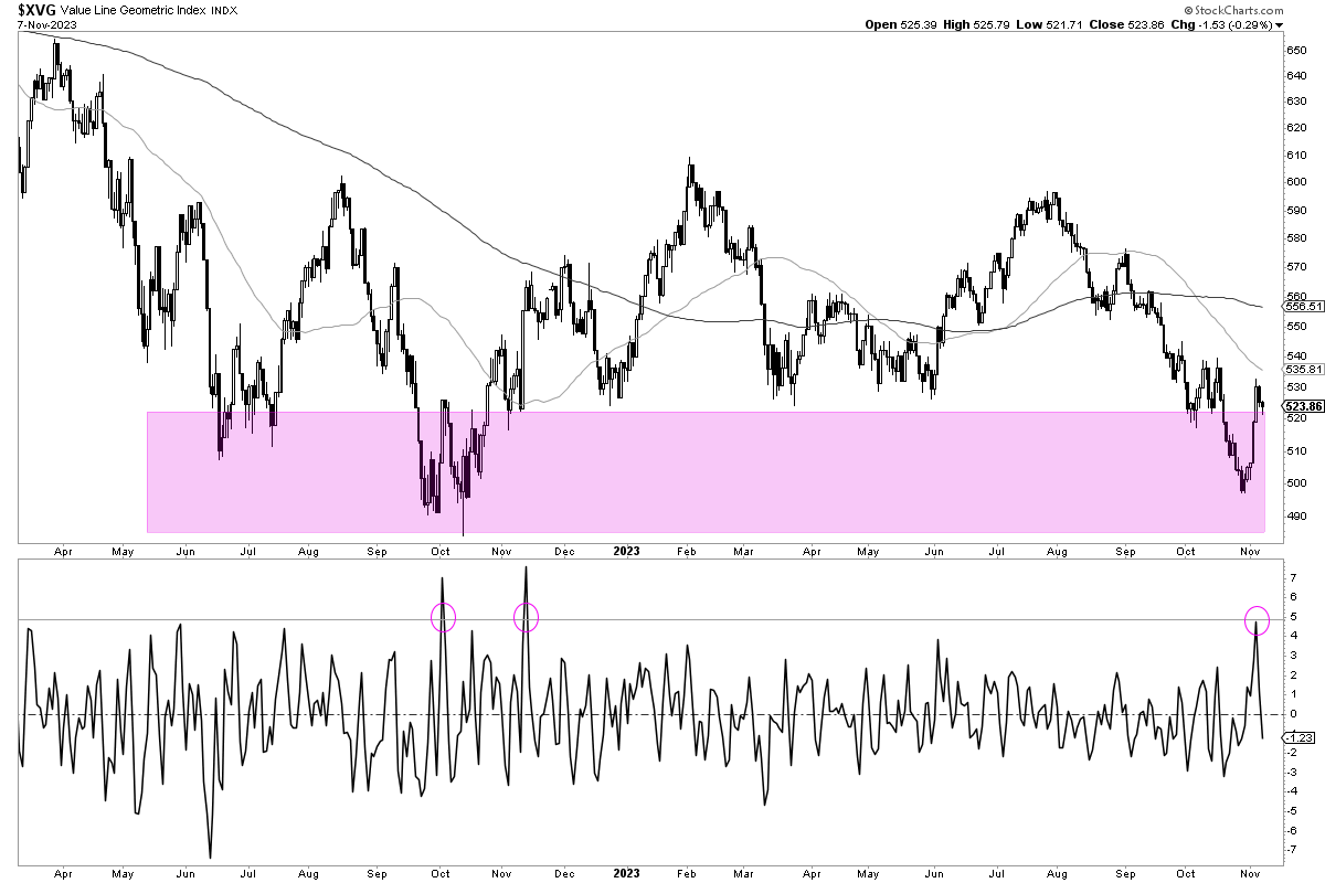 Tras unos días donde la amplitud entró en barrena adentrándose en la "zona de peligro" y acercándose rápidamente a los mínimos de octubre de 2022 -fecha en la que comenzó el mercado alcista global-, por fin se produjo un intenso rebote donde la amplitud repuntó cerca de un 5% en solo 2 días.