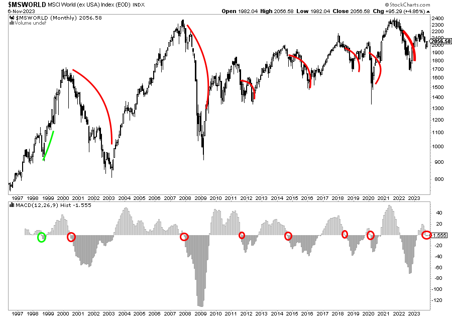 Lo ocurrido la pasada semana es una buena mejora pero, de nuevo, necesito ver más. Si nos olvidamos por un momento de la bolsa estadounidense y nos centramos en la bolsa global ex-EEUU, como muestra el siguiente índice $MSWORLD, vemos que típicamente cuando el indicador MACD mensual gira a la baja, tal y como ocurrió al cierre del pasado mes de octubre, la inercia suele seguir yendo a la baja. ¿La última vez que se produjo una lectura negativa que fue un falso positivo? En 1998, hace nada menos que un cuarto de siglo.